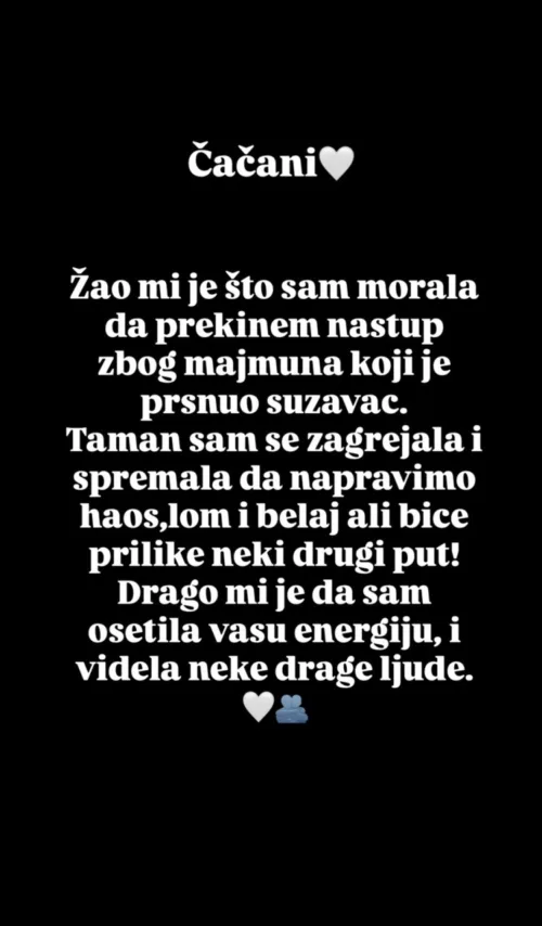 „Čačani, žao mi je što sam morala da prekinem nastup zbog majmuna koji je prsnuo suzavac. Taman sam se zagrejala i spremala da napravimo haos, lom i belaj, ali biće prilike neki drugi put! Drago mi je da sam osetila vašu energiju i videla neke drage ljude“, napisala je Edita Aradinović, prenosi Telegraf.